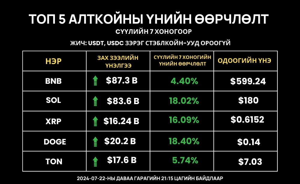 Топ алткойнууд (ETH ороогүй)-ын хувьд сүүлийн 7 хоногийн байдлаар бүгд өсөлттэй байна. Харин зах зээлийн үнэлгээ өндөртэй койн, токенууд дотроос сүүлийн долоо өдрийн байдлаар Solana (SOL) 18%, Dogecoin 18.4% өсөлттэй байна.