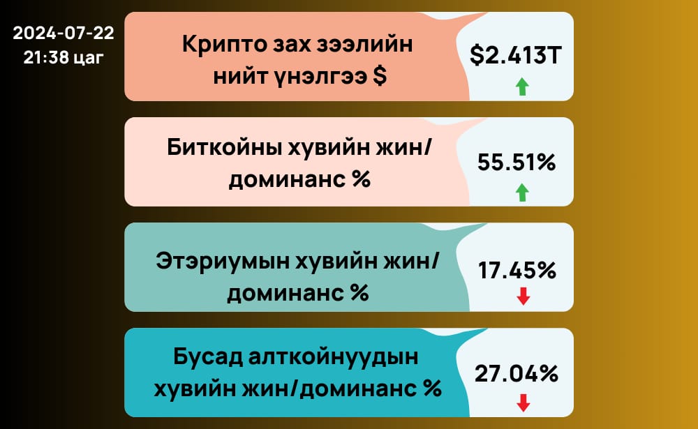 Крипто зах зээл Ж.Байден сонгуулиас нэрээ татсаныг ерөнхийдөө сайн мэдээ гэж хүлээж авсан бөгөөд Д.Трампийн криптод ээлтэй бодлого, байр суурь сонгууль хүртэл крипто зах зээлд өсөлт авчирсаар байх болно гэсэн хандлага давамгайлж байна.