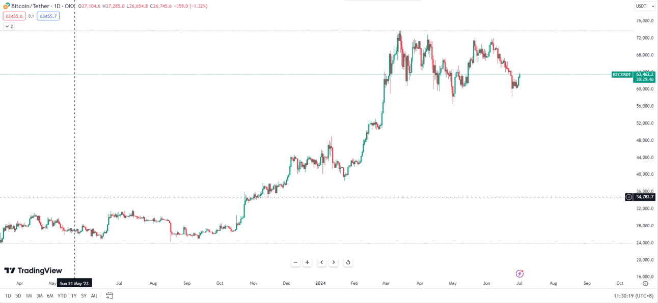 Техник шинжилгээ хийж харвал биткойн өнгөрсөн Бямба гарагт 60,000 ам.долларын эрэлтийн бүст дэмжлэг аван нийлүүлэлтийн хөндлөн бүсийг сэтлэн өссөн байдалтай байгааг доорх зургаас харна уу.