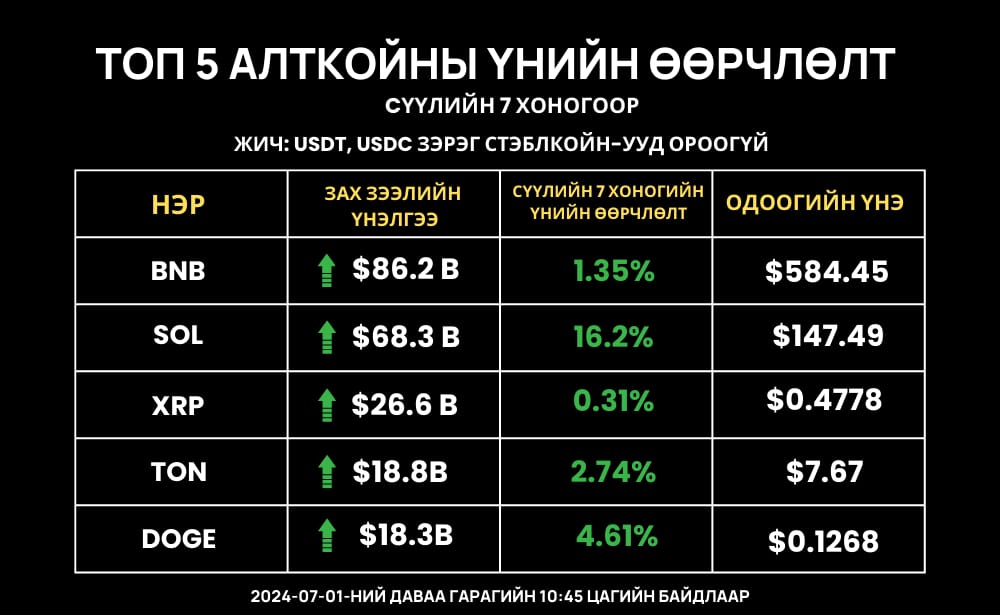 Зах зээлийн үнэлгээгээр хамгийн томд орох алткойнуудын үнэ сүүлийн 7 өдрийн байдлаар дараах байдалтай байна. Үндсэндээ том алткойнууд бүгд өсөлтийн байдалтай байна.