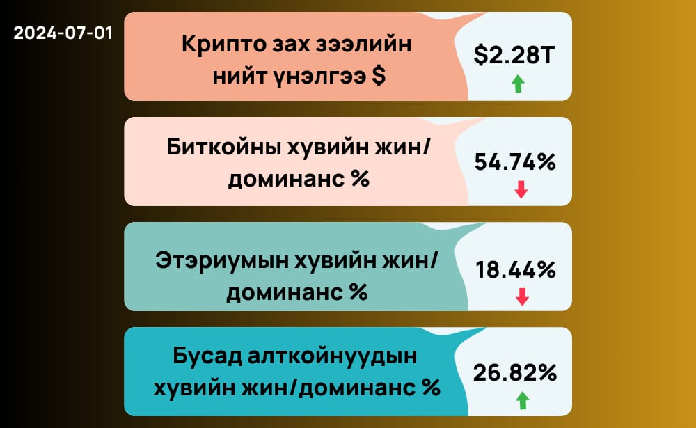 Өнгөрсөн долоо хоногт биткойн болон этэриум гэсэн 2 том криптовалют тус бүр 5% болон 3% унасан боловч амралтын өдрүүдээр 4.3% болон 3%-иар өсөв. Даваа гарагийн 11:30 цагийн байдлаар нэгж биткойны үнэ 63,462 ам.долларын үнэтэй байна.