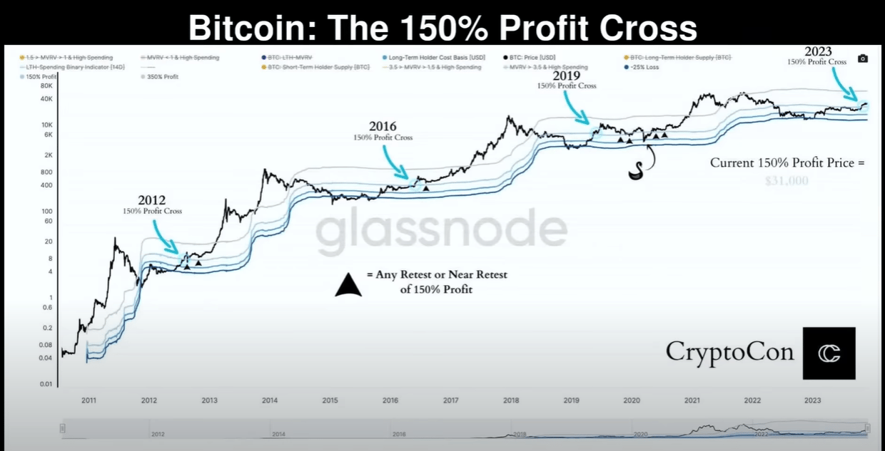 Крипто судалгааны Glassnode-ийн мэдээлснээр биткойны үнийн уналтын өмнөх циклүүдийн дараа үнэ 150% өсч байжээ. Тухайлбал 2012, 2016, 2019 орнуудад үний 150%-ийн өсөлт үзүүлсний дараа үнэ дандаа огцом өсч байжээ. Тэгвэл 2023 он гарснаас хойш өнөөдрийн байдлаар биткойны үнэ 150% өсөөд байна.