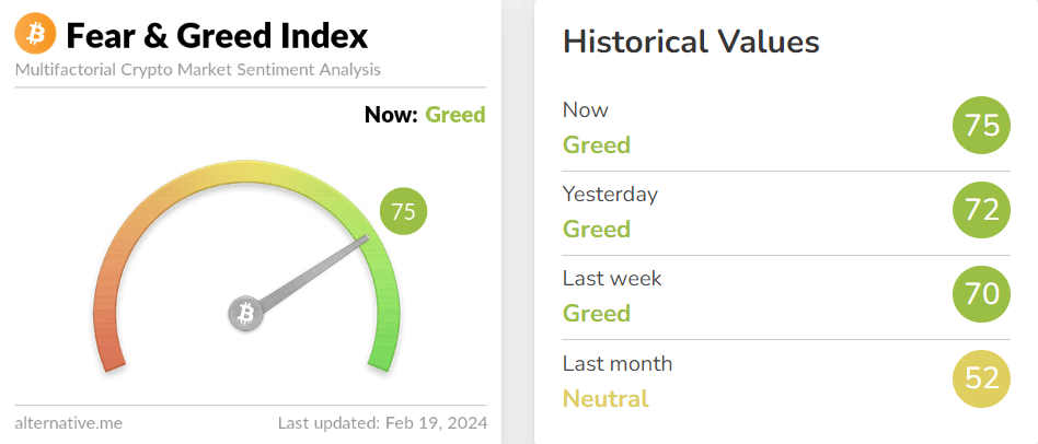 Крипто зах зээл дэх тоглогчдын сэтгэл зүйн байдал өнөөдрийн байдлаар Айдас ба шуналын индексийн дагуу 75 гэсэн үзүүлэлттэй байна. Өнгөрсөн долоо хоногт энэ үзүүлэлт 70 байсантай харьцуулахад хөрөнгө оруулагчдын итгэл, өөдрөг байдал сэргэсэн байна.