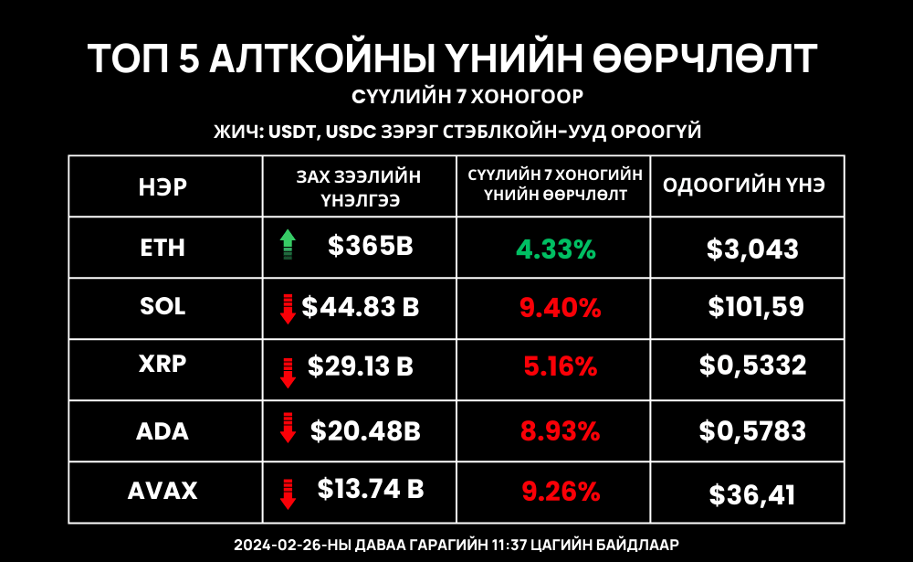 Бусад топ алткойнуудын сүүлийн долоо хоногийн үнэ, ханшны мэдээллийг доорх хүснэгтээс харна уу. ETH-ээс бусад топ алткойнууд ерөнхийдөө уналтын байдалтай байна.