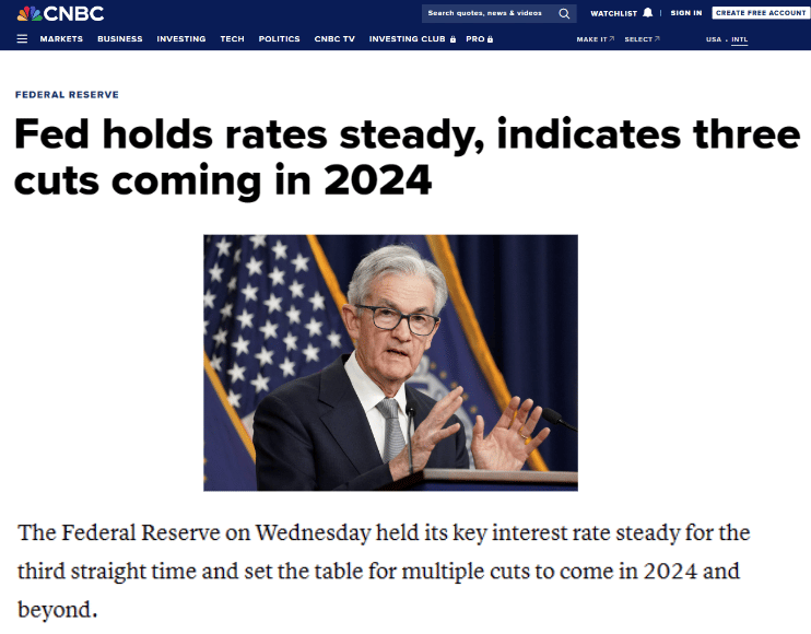 Өнгөрсөн Лхагва гарагт болсон Холбооны нөөцийн сангийн Нээлттэй зах зээлийн хорооны хурлаар бодлогын хүүг хэлэлцсэн бөгөөд хурлын үр дүнд одоогийн 5.25-5.50% түвшинг хэвээр хадгалахаар шийдвэрлэв. Холбооны нөөцийн сангийн тэргүүн Жером Пауэл дээрх хурлын дараа хийсэн хэвлэлийн бага хурлын үеэр хэлсэн үгэндээ ирэх онд төв банк бодлогын хүүг 3 удаа буулгаж магадгүй гэсэн дохиог зах зээлд өгөв. Энэхүү мэдээний дараа биткойны үнэ 7.2% хүртэл өсөв.
