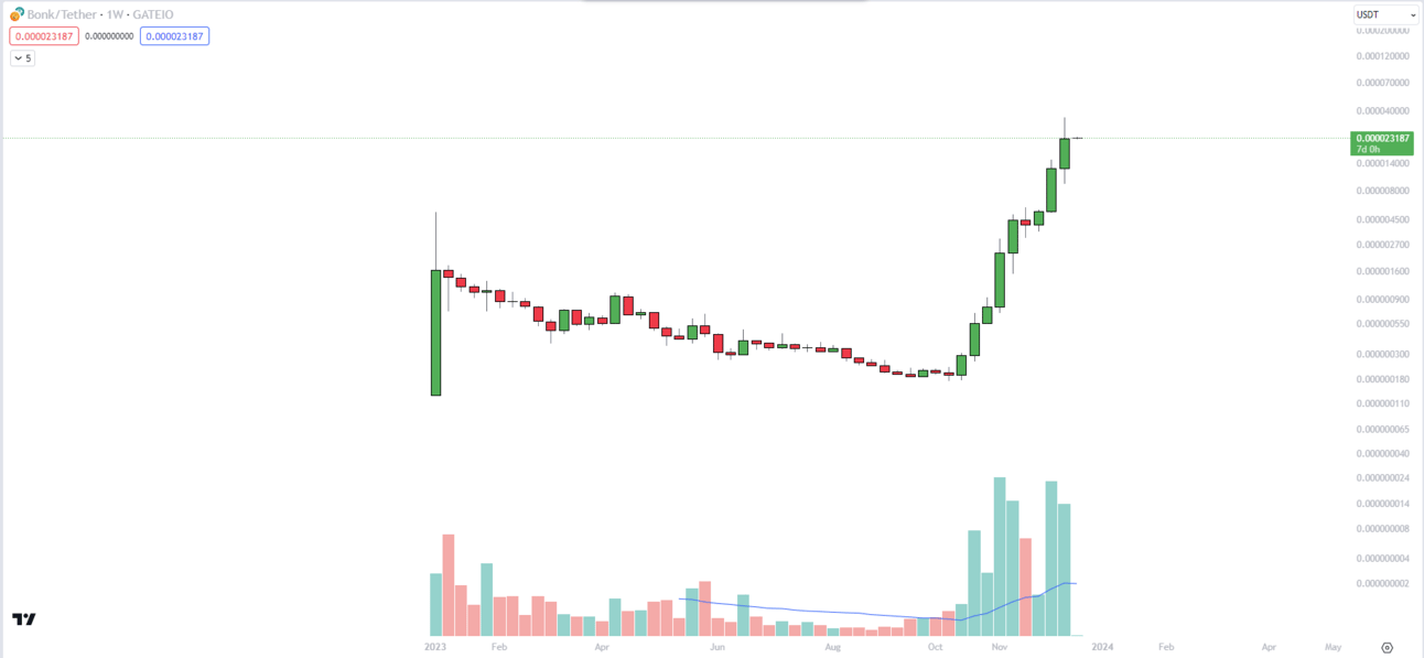 Зах зээлийн үнэлгээ багатай алткойнууд дотроос “meme coin” болох Bonk Inu (BONK) өнгөрсөн долоо хоногт 267% хүртэл өсөв. Нохойны дүрс бүхий уг meme coin сүүлийн нэг сарын хугацаанд 1,200% өсч зах зээлийн үнэлгээ нь 1.4 тэрбум ам.долларт хүрэв. Өнөөдрийн 08:48 цагийн байдлаар нэгж BONK койны үнэ 0.000023070 ам.доллар байна.