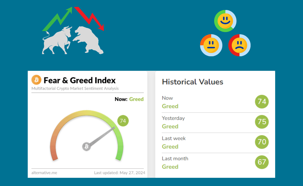Крипто зах зээл дэх тоглогчдын сэтгэл зүйн байдал өнөөдрийн байдлаар Айдас ба шуналын индексийн дагуу 74 (Greed) үзүүлэлттэй байна. Өнгөрсөн долоо хоногт энэ үзүүлэлт 70 (Greed) байсантай харьцуулахад зах зээлийн сентимeнт илүү “bullish“ болсныг харуулж байна.