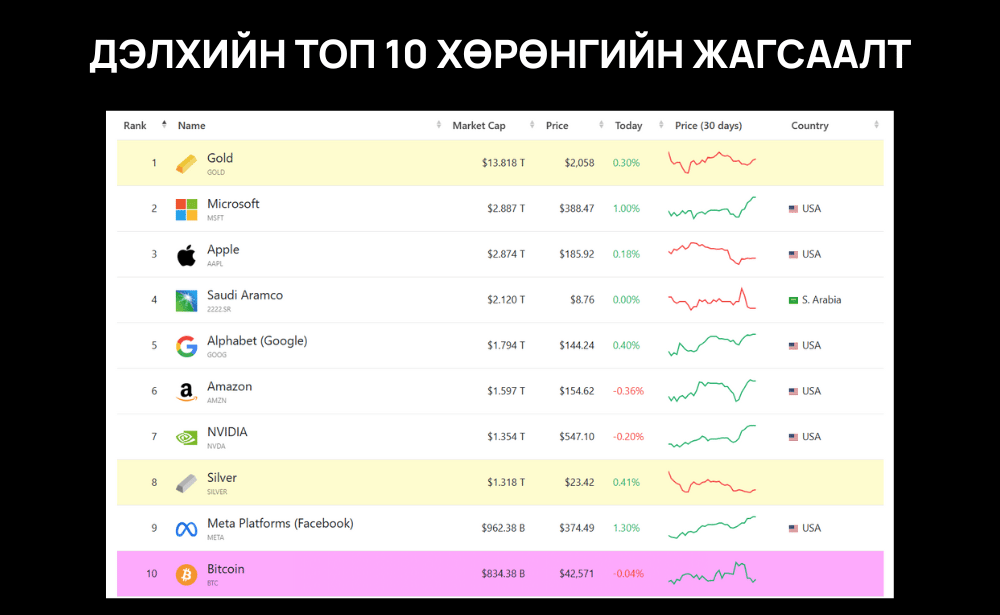 Биткойны зах зээлийн үнэлгээ өнөөдрийн байдлаар 834 тэрбум ам.доллар байгаа нь дэлхийн хамгийн үнэ цэнэтэй хөрөнгүүдийн жагсаалтад 10-р байрт явж байна. Хөрөнгүүдийг харьцуулсан доорх зургийг харна уу.