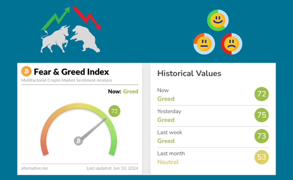 Крипто зах зээл дэх тоглогчдын сэтгэл зүйн байдал өнөөдрийн байдлаар Айдас ба шуналын индексийн дагуу 72 (Greed) үзүүлэлттэй байна. Өнгөрсөн долоо хоногт энэ үзүүлэлт 73 (Greed) байсантай харьцуулахад зах зээлийн сентимeнт бараг өөрчлөгдөөгүй байна.