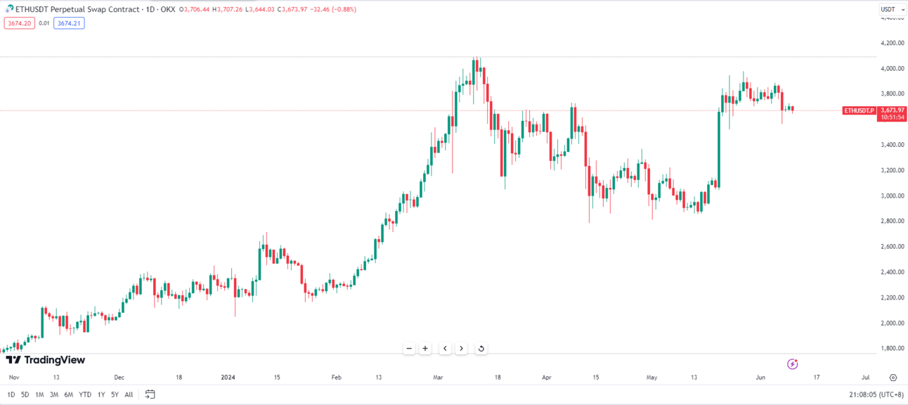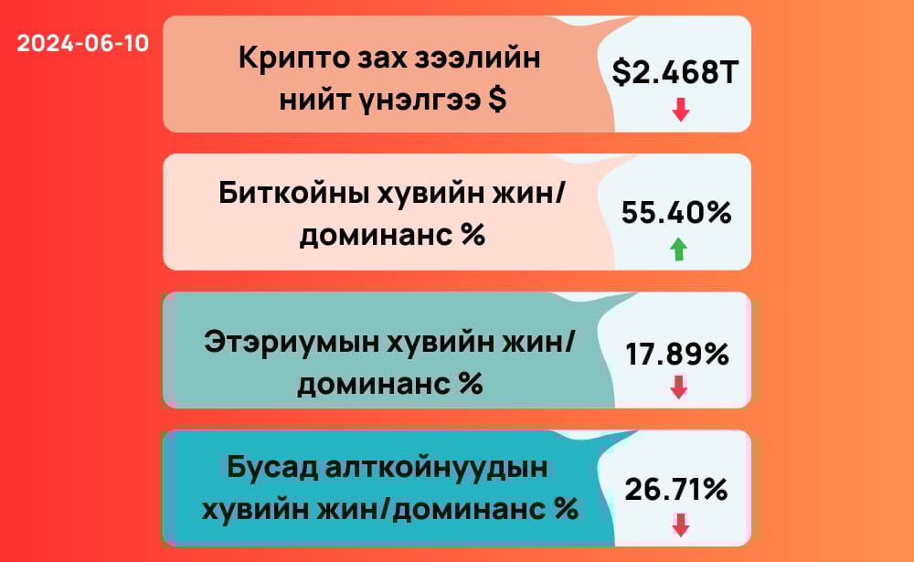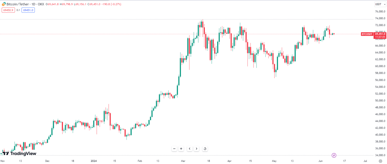 Өнгөрсөн долоо хоногт биткойн 6.3% хүртэл өсч бараг 72,000 ам.доллар хүрсэн ч Баасан гарагт 5% буюу 68,300 ам.доллар хүрч унав. Өсөлтийн шалтгаан нь спот биткойны ETF сангийн хувьцаанд оруулсан хөрөнгө оруулагчдын мөнгөн хөрөнгийн хэмжээ 6 дугаар сарын 4-ний Мягмар гарагт 886,7 сая ам.долларт хүрсэн нь түүхэндээ хоёрдугаарт орохуйц томоохон хөрөнгө оруулалт болов. Энэ нь байгууллагын хөрөнгө оруулагчдын биткойнд итгэх итгэл сэргэснийг илтгэв.
