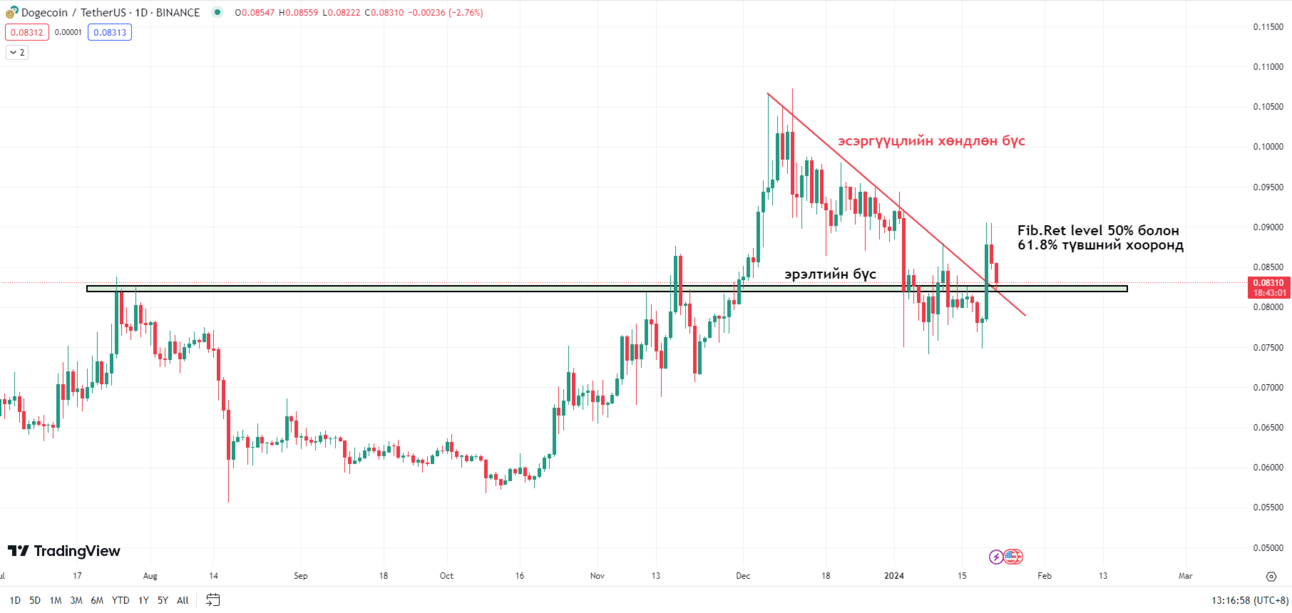 “Цуурхал дээр нь аваад жинхэнэ мэдээ гарахад нь зар” гэсэн арилжаачид, хөрөнгө оруулагчид ярьдаг. Dogecoin үзүүлж байгаа үнийн хөдөлгөөнд техник анализ хийн харахад долоо хоногийн график дээр сүүлийн 600 гаруй хоног суурь үүсгэж байна. Хажуугийн хөдөлгөөн буюу суурийг хэдийчинээ удаан үүсэх тусам дээшээ хүчтэй өсөх магадлалтай нэмэгдэх хандлагатай байдаг. Одоогоор үнэ долоо хоногийн график дээр higher high хийж, өсөлтийн тренд үзүүлж байна. Мөн сүүлийн 25 долоо хоногийн дундаж үнэ дээр сүүлийн 3 долоо хоногийн хугацаанд дэмжлэг авчээ.