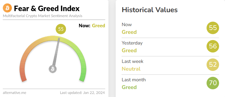 Крипто зах зээл дэх тоглогчдын сэтгэл зүйн байдал өнөөдрийн байдлаар Айдас ба шуналын индексийн дагуу 55 гэсэн үзүүлэлттэй байна. Өнгөрсөн долоо хоногт энэ үзүүлэлт 52 байсантай харьцуулахад хөрөнгө оруулагчдын итгэл, өөдрөг байдал бага зэрэг сэргэсэн байна.